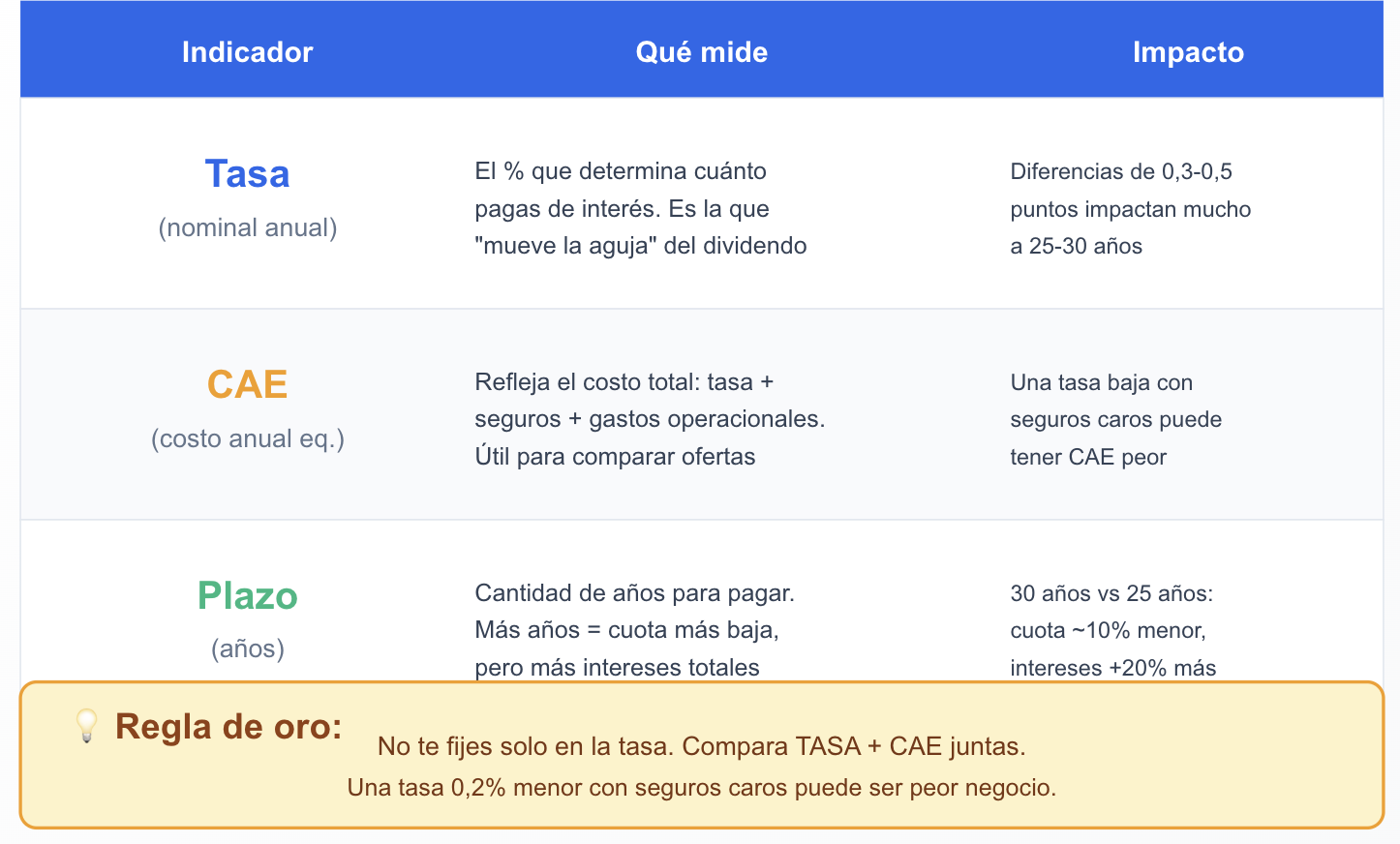 - CAE: indicador que intenta reflejar el costo anual equivalente sumando tasa + seguros + gastos. Útil para comparar ofertas de manera global.